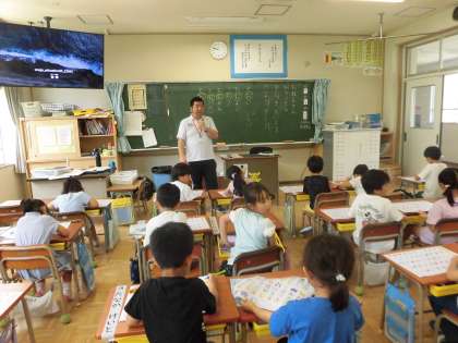 1年6組では、ひらがなの学習を進めています。今日は、ひらがな学習プリントに丁寧になぞっていきました。書き終わったら、井上崇先生に見せに行きます。丸をもらって、子ども達もうれしそうでした。