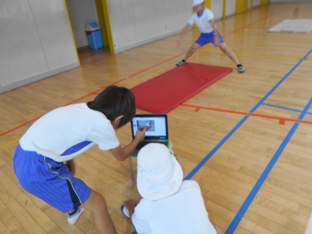 5年生 たくさんの場の工夫があり、子どもたちは、考えながら練習に取り組んでいました。自分の動きを、タブレットで確認していました。