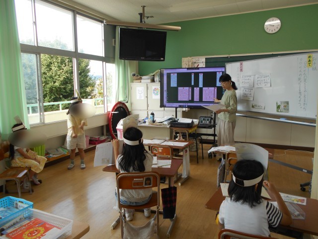 2年生のお手紙の学習をしていました。お面をつけ、人物の気持ちを考えていました。