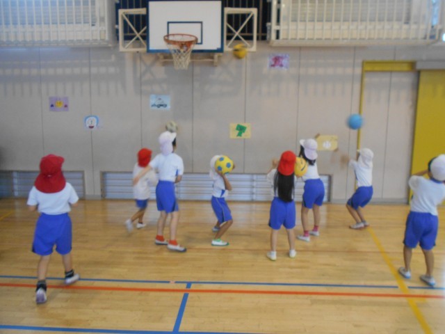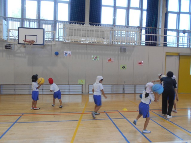 体育館の壁に体育委員会が作成した点数付きの的が貼ってあります。1年生の子どもたちは、一生懸命にボールを投げて、〇点やった~と喜んでいました。