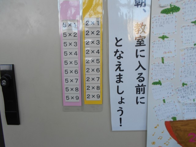 「かけ算を唱えてから教室へ入りましょう」の掲示を見つけました。しっかりとかけ算の仕組みを理解し、覚えられるといいですね。