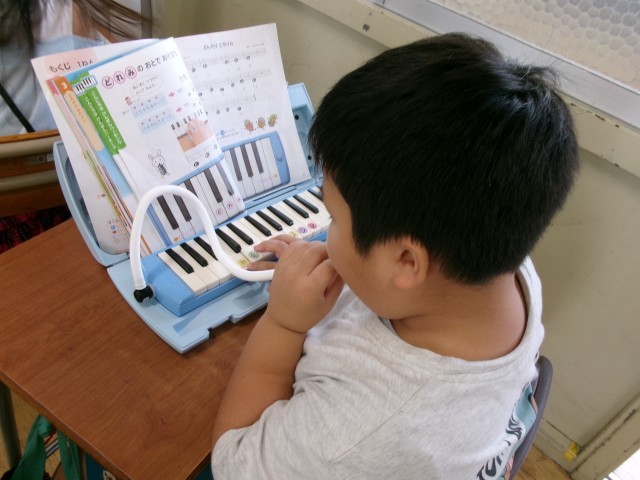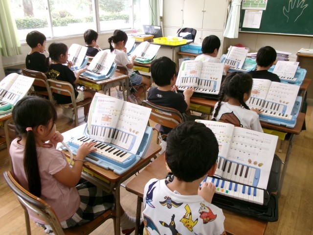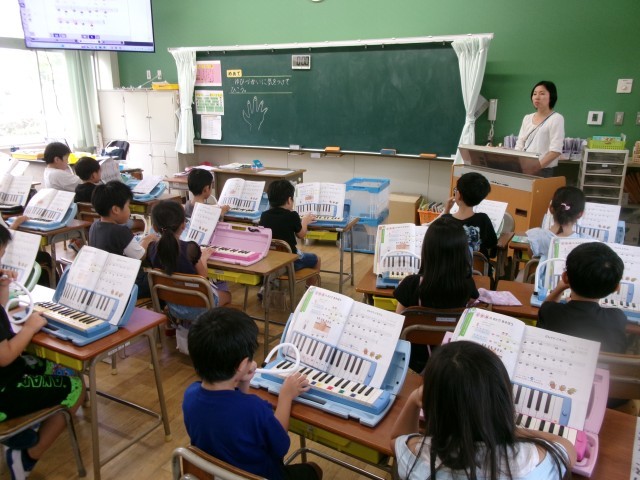 1年生の子どもたちが、鍵盤ハーモニカで全員合奏をしていました。指を置く場所に気を付けながら楽しそうに演奏していました。
