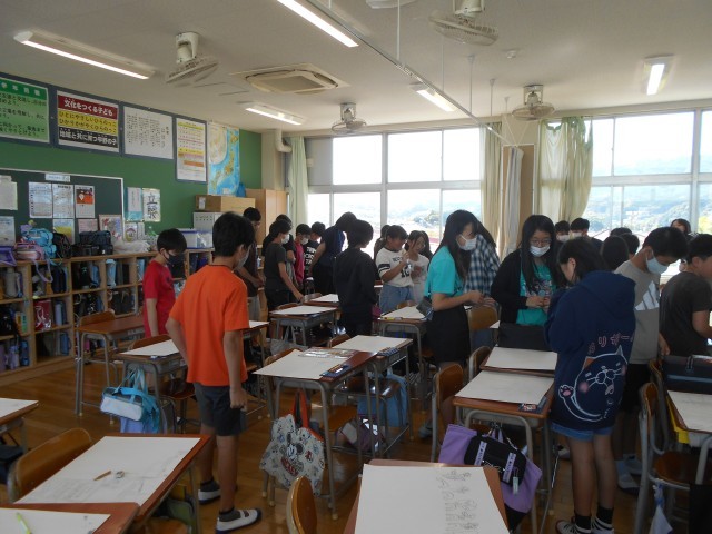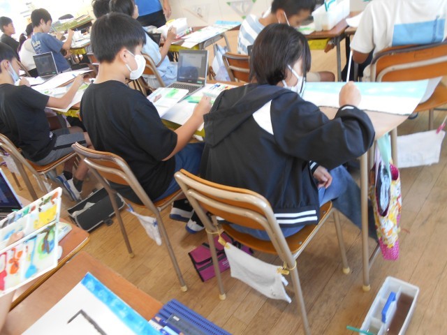 遠近法をつかって、お気に入りの風景を描いています。3枚目の写真は、下書きの段階で友達の絵を見て回っていました。