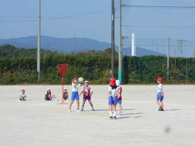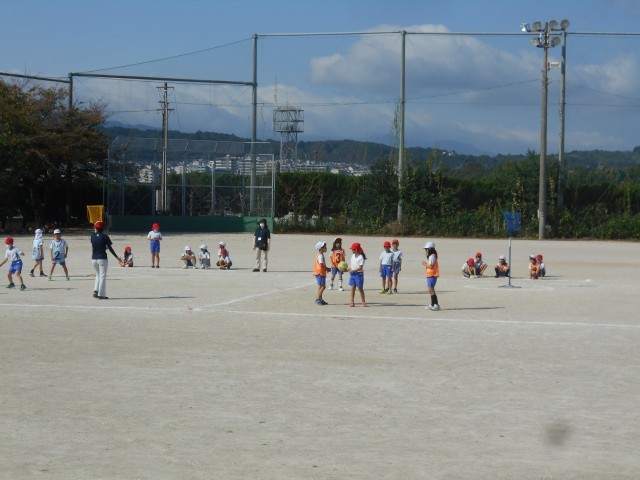 秋晴れの下、チームで声をかけあって、ゲームをしていました。座ってみているチームも応援している姿が素敵でした。