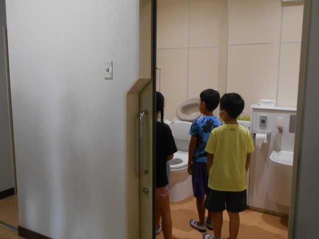 学校内のバリアフリーについて、調べていました。多目的トイレを見学しています。