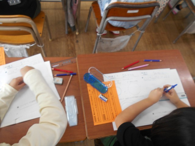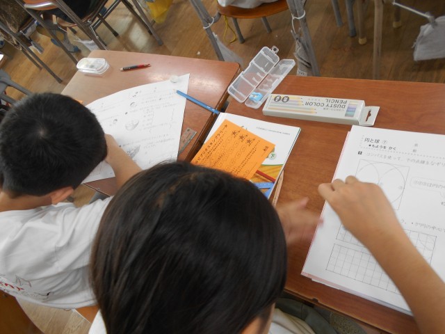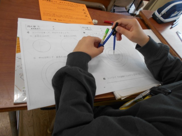 算数の学習でコンパスを使って、円をかいています。要領をつかむまでは、何度もチャレンジ!です。