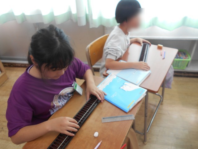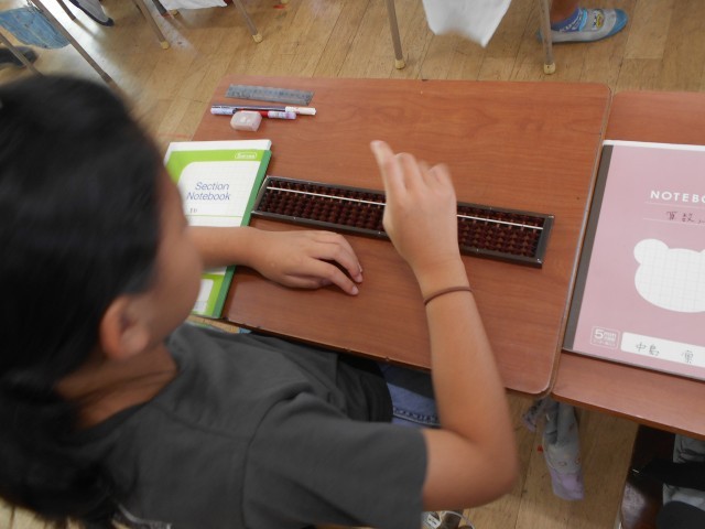 そろばんを使う学習をしています。初めて触る子どもたちは、楽しみながら計算していました。