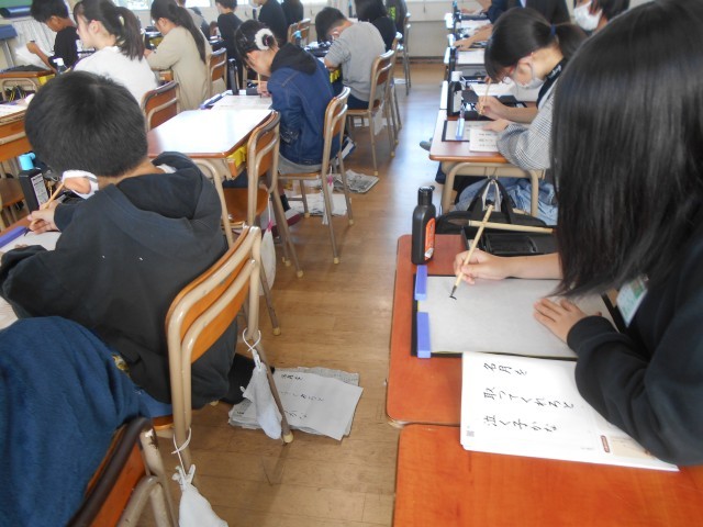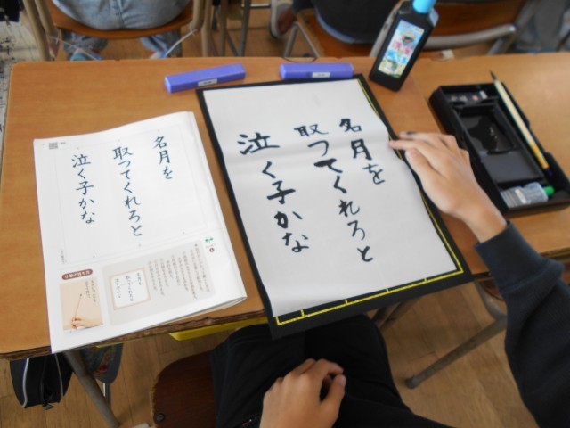 小筆を使って、3行のバランスをとりながら一生懸命に書いていました。