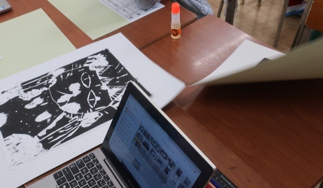 版画の学習も大詰め。仕上がった版を画用紙に貼っていました。