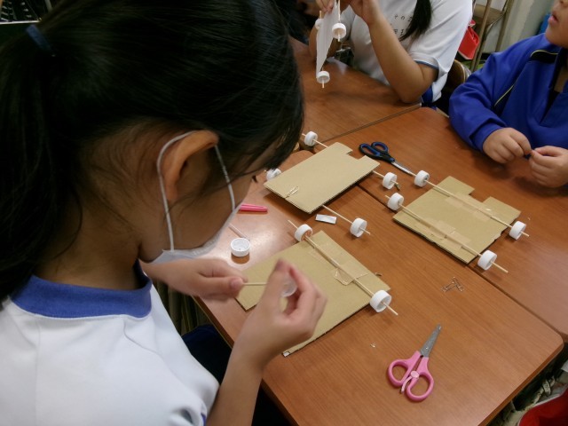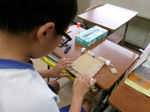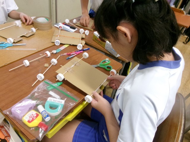 段ボールや串、キャップ、輪ゴムを使って動く車を作っていました。キャップに串を通して、ちゃんと回るか確かめながら楽しそうに活動していました。動く車が完成するといいですね。
