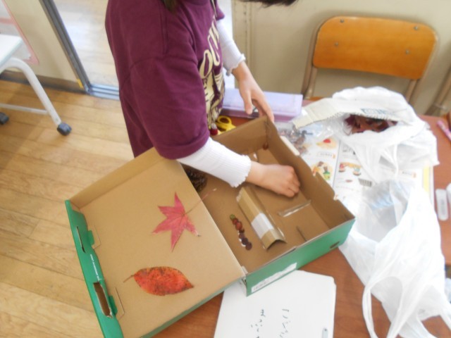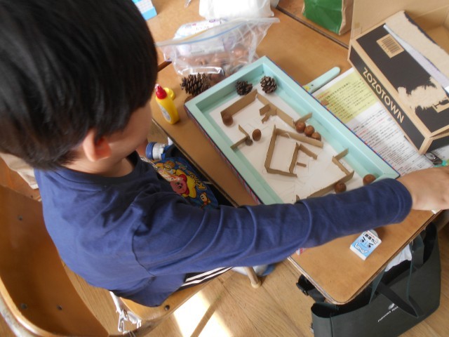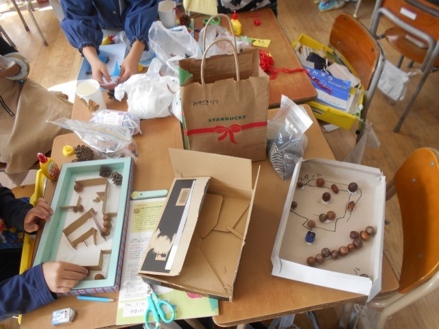 「楽しい 秋いっぱい」の学習で、どんぐりや落ち葉をつかって、迷路をつくりました。ひとぞれぞれの工夫があり、とても素敵な作品ができました。