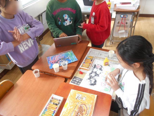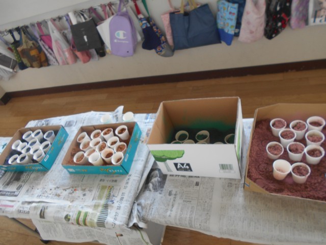 学校の砂に色をつけ、好きな砂絵をかきました。砂の感触を楽しみながら、楽しい作品ができました。