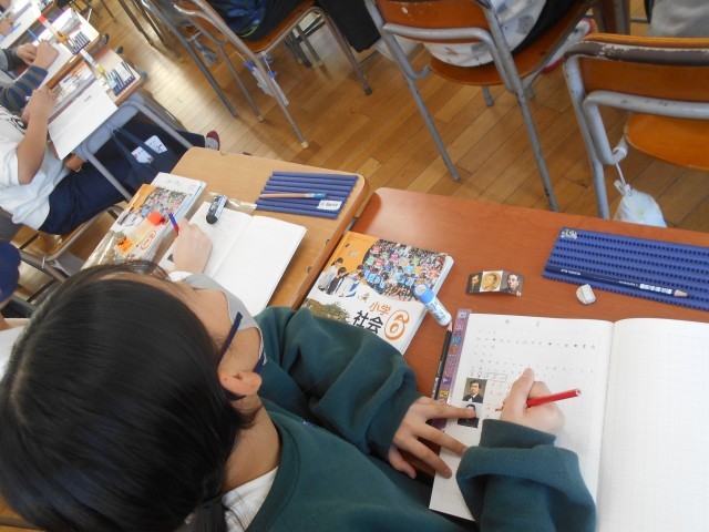 歴史学習をしていました。歴史上の人物シールがついているので、ノートに整理しやすくなっています。