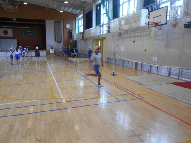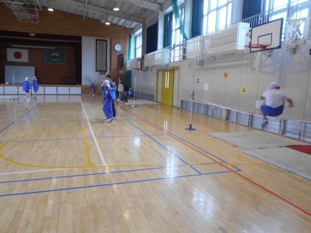 走り高跳びをしていました。道具や場の工夫がしてあり、奇数で助走するコツなどを意識して練習をしていました。