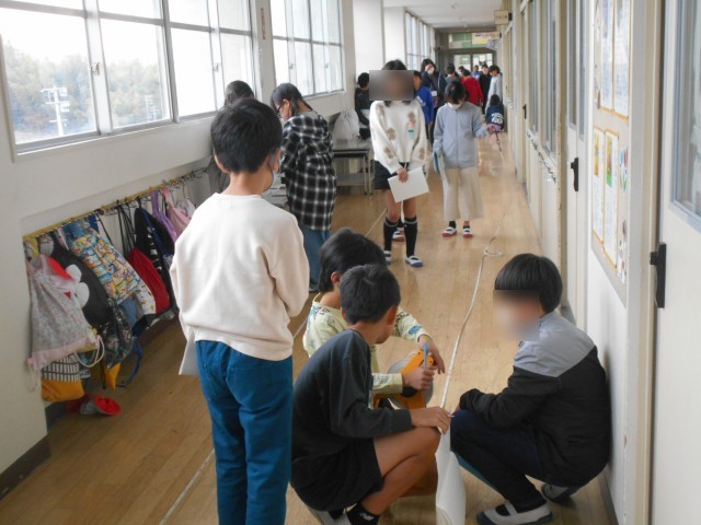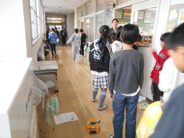 10歩で何メートルになるのかをはかり、1歩の長さをグループで協力して調べていました。