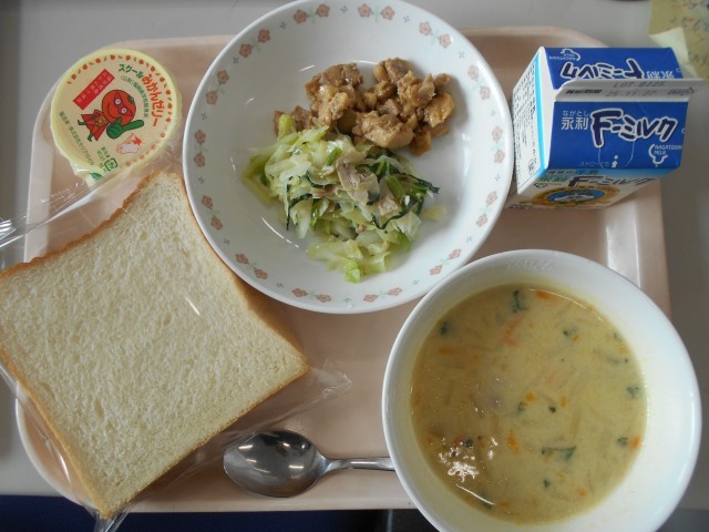 今日は、わくわく献立で、「てりやきチキンサンド(減塩食パン・てりやきチキン・キャベツのソテー)、牛乳、じゃかいもと豆乳のスープ、みかんゼリー」でした。食パンに自分ではさんで食べました。おいしかったです。