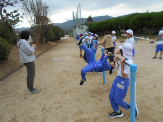 鉄棒、雲梯、上り棒にチャレンジしました。友達と声をかけあう姿が素敵でした。
