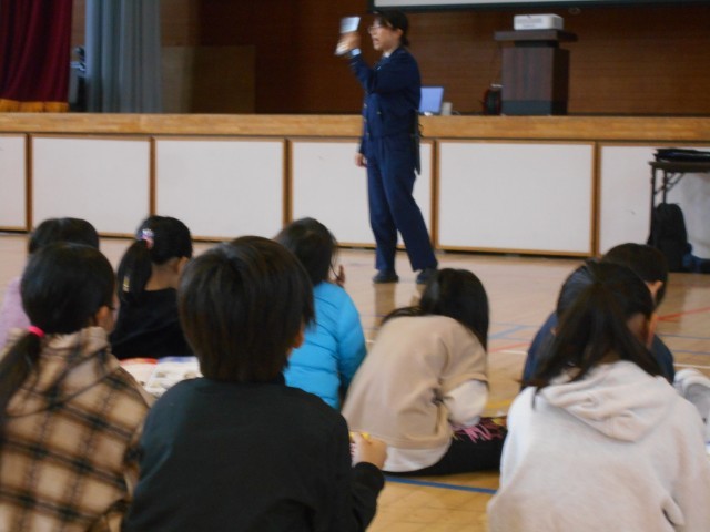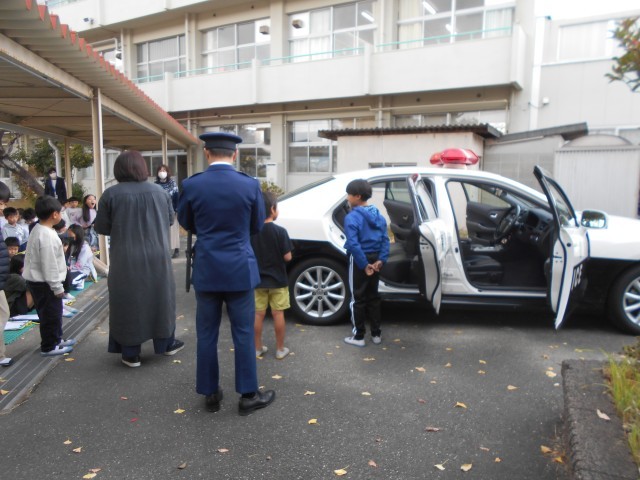 春日警察署の方にお越しいただき、警察官のお仕事のお話をうかがったり、パトカーの仕組みを教えていただいたりしました。子どもたちは、興味津々で、質問をたくさんしていました。