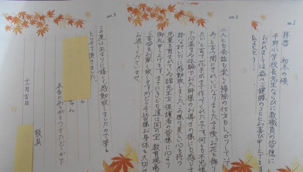公園の落ち葉掃除をしてあった方から学校にお便りがとどきました。2年生の女の子が「手伝います」と声をかけてくれました。とても驚かれたそうですが、二人との会話も楽しく、あっという間にきれいになったそうです。あまりにもうれしくそして、感動されたので、お礼のお手紙がとどきました。地域でやさしい平野っ子として活躍できる子どもたち、そしてそのことをほめてくださる地域の皆様に心より感謝いたします。