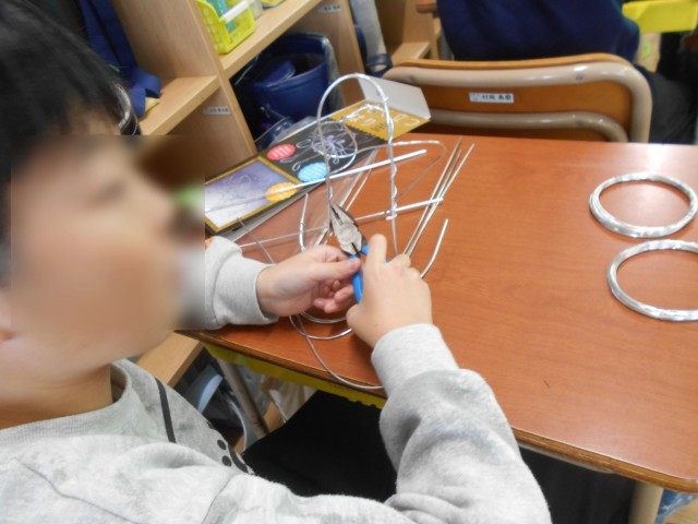 針金を自由にまげて立てて美しい飾りを作成していました。それぞれ工夫していました。