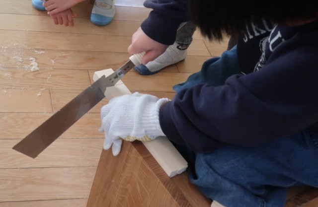 安全に気を付けて木材をのこぎりで縦にななめに切っていました。3年生と同じで友達と協力したり見守ったりしながら活動していました。