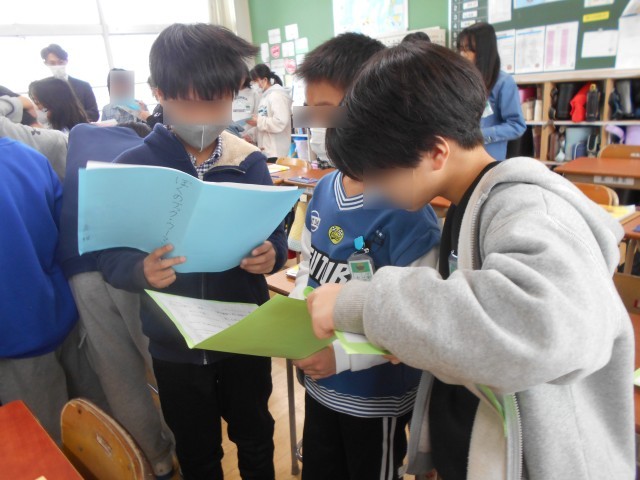 「ぼくのブックウーマン」の学習でした。追求した関係性の違いによって、色画用紙が異なることで、自分とは違う視点での交流が行われました。問いを解決するために、子どもたちはよく話し合っていました。