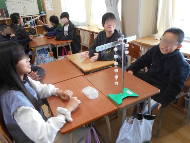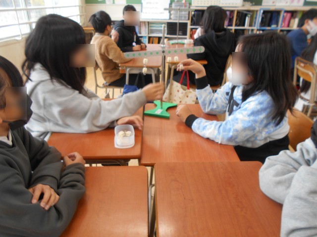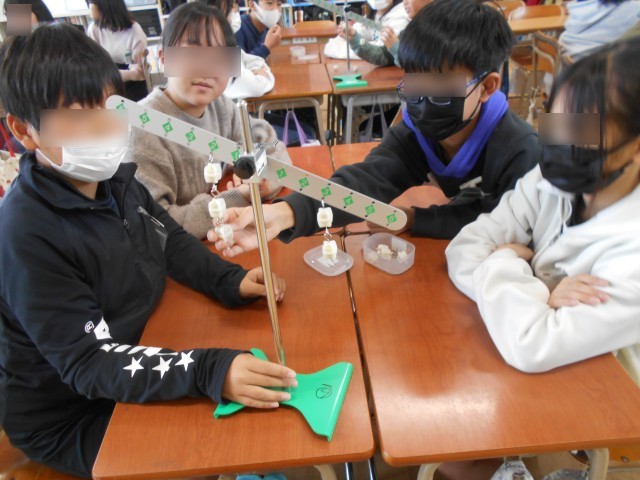 左右の腕にいくつおもりをつけたらつりあうのか、いろいろと実験していました。班で協力して、つりあったら自然と笑みがこぼれていました。