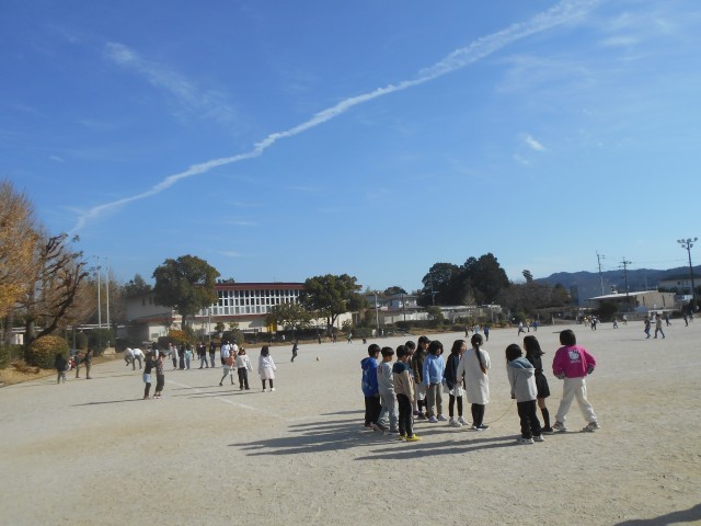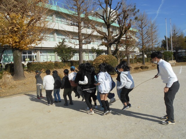 温かい日差しの中、子どもたちは元気に遊んでいます。大縄跳びにチャレンジしたり、クラス遊びをしたりと、たくさんの先生方も一緒に楽しんでいました。