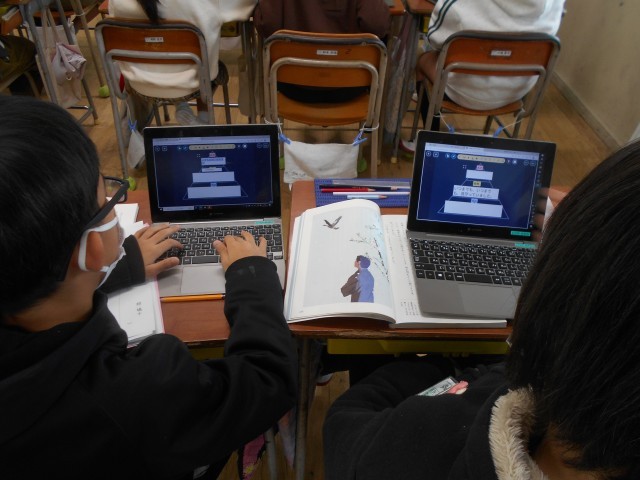 「大造じいさんとガン」の学習をしています。叙述を根拠に、問いに対する自分の考えをまとめていました。