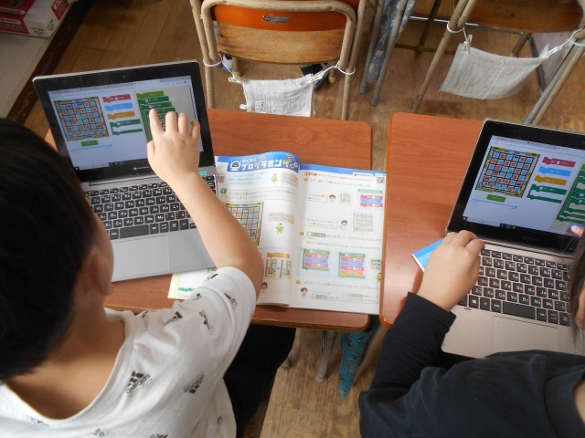プログラミング学習をしていました。教科書にそって、自分で組み立てていきます。(子どもの吸収力ってすごいです)