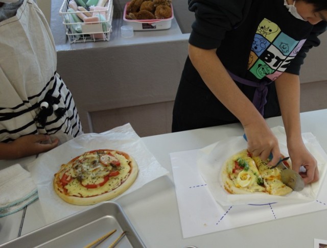 6年生は、具材を切るところからピザを作ったり、低学年の子にも教えたりしながら活動しました。