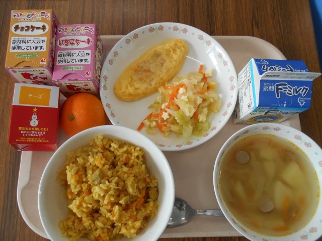 クリスマス前の最後の給食は、カレーピラフ、牛乳、トマトオムレツ、星のチーズサラダ、じゃがいもと豆のスープ、デザートでした。デザートは、豆乳チョコケーキ、豆乳いちごケーキ、レアチーズケーキ、みかん から自分の好きなものを選びました。1年生は、初めて給食にケーキがでたので、テンションが高くとても喜んでいました。サラダのチーズが星型で、可愛かったです。