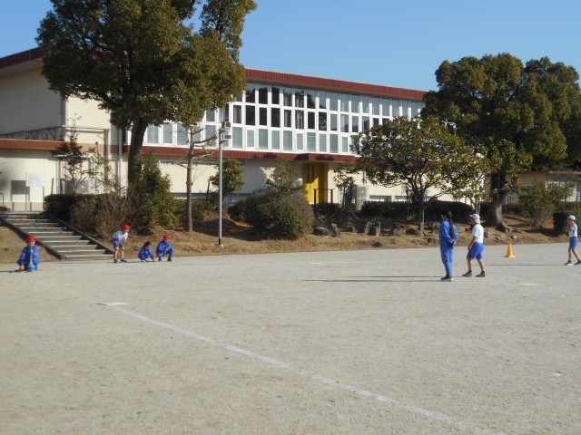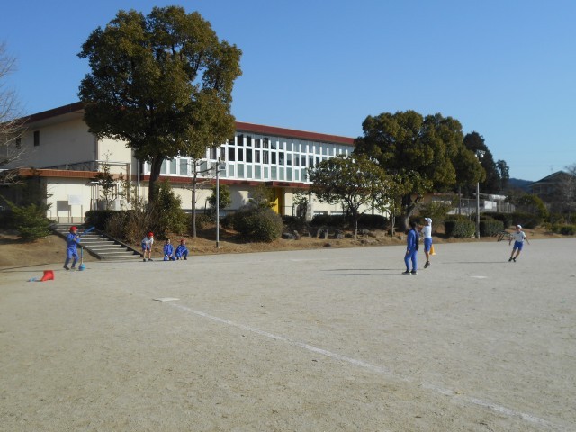 グループで協力し、ボール運動を楽しんでいました。止まっているボールを軽いバットでうつ、バットを指定の場所に置くという安全面に配慮したゲームです。運動が得意な子どももそうでない子どもも楽しく参加できる工夫があります。