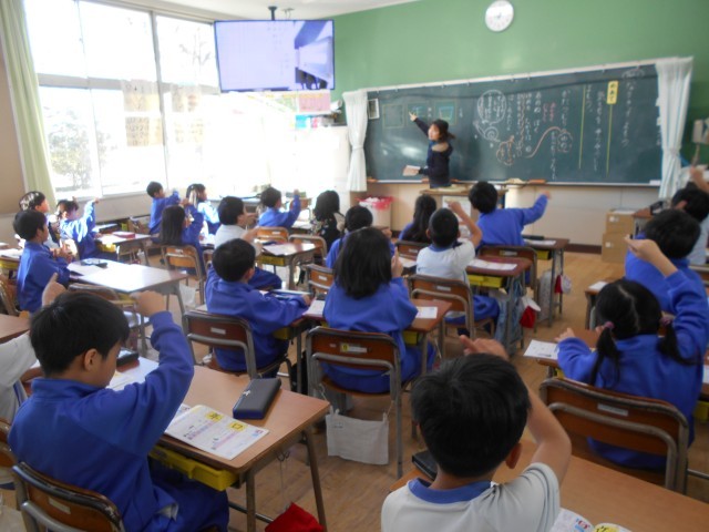 読み方、書き順などを確認し、みんなで手を挙げて、「イチ、ニ、サン・・・・」と空書きして学習します。言いながら、見ながら、そして手を動かしながら練習することで、覚えていきます。
