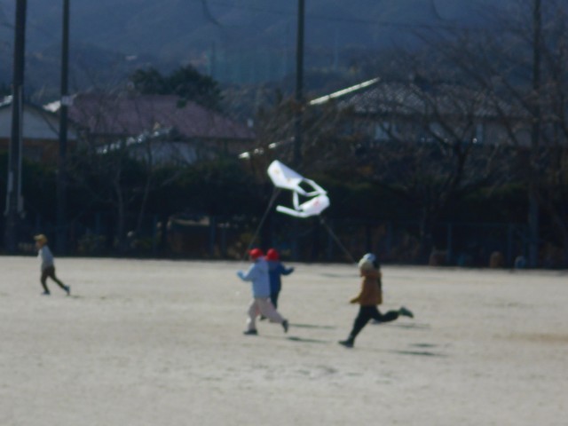 昨日、1年生が自分で絵を描いた凧で、運動場でたこ揚げをしていました。風が強かったので、よく上がり、喜んでいました。