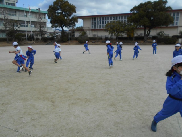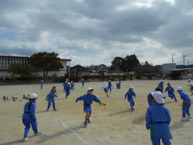 4色のタグをつけて、しっぽとりゲームをしていました。相手が油断した隙に、タグを上手にとる子もいました。寒いけど、たくさん動いて体が温まりました。