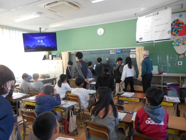 グループ対抗の英語でのクイズ大会がありました。協力して答えを黒板に書いていきました。