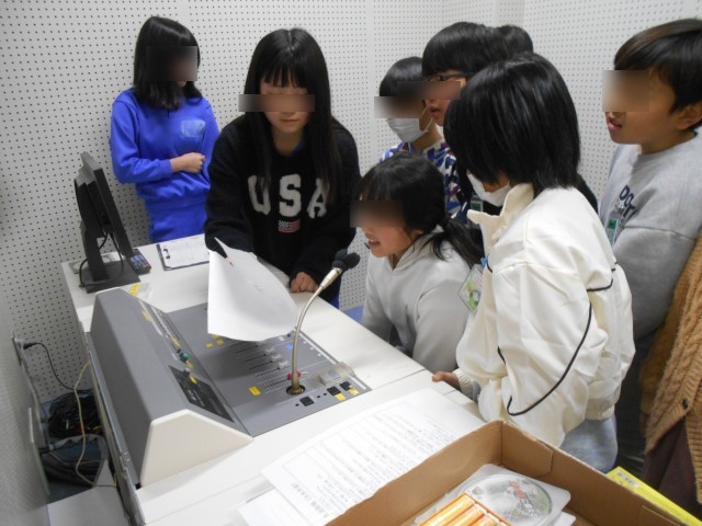 4年生が委員会の体験として、放送室に来ました。実際に放送するセリフを練習していました。6年生が優しく教えてくれました。