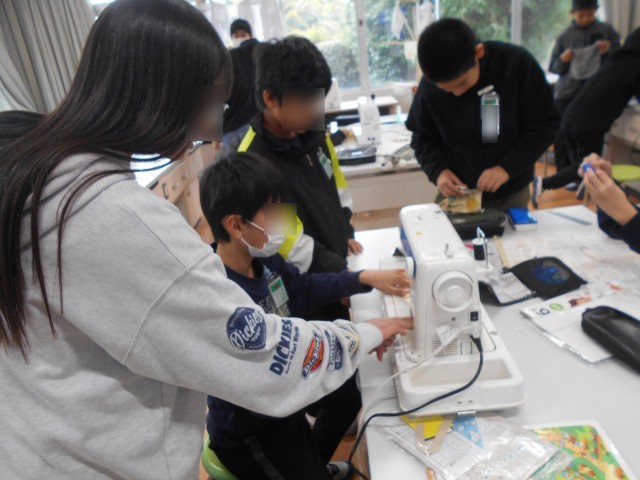 友達と協力しながら、家族へのプレゼントを作製しています。