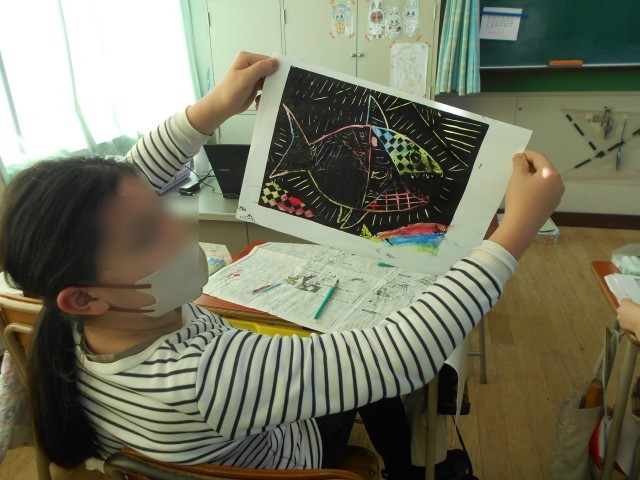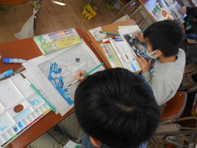 彫刻刀で掘り、印刷をし、絵の具で色を付けます。ひっくり返すととても素敵な色合いになりました。