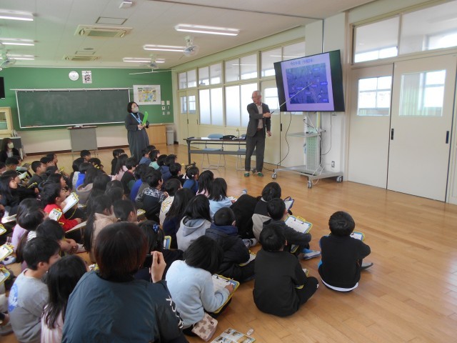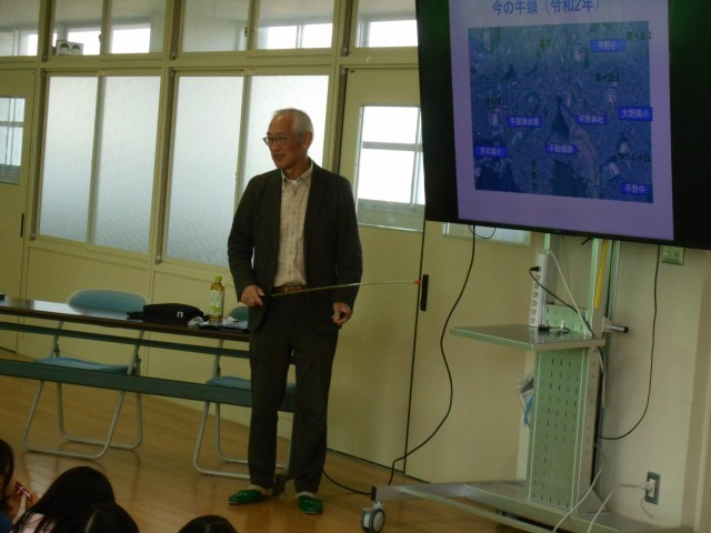 牛頸区の区長様をお招きして、牛頸の歴史や祭りなどのお話を聞きました。調べ学習はしていたものの、知らないことがたくさんあり、自分たちのふるさとのすばらしさを実感したようでした。区長様、ありがとうございました。