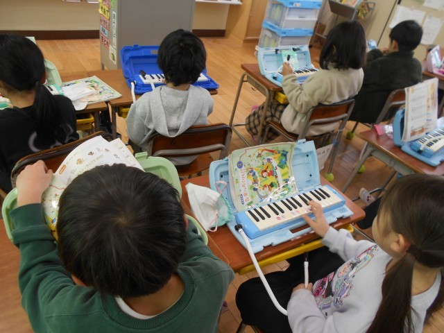 鍵盤ハーモニカの練習をしていました。ゆっくり指使いに気を付けて頑張っています。