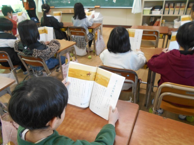 「スーホの白い馬」の学習です。しっかりと教科書を立てて音読しています。音読はとてもよい効果があります。デジタルではない、紙にある文字を目で追い、声に出して自分の耳で聞く、脳にしっかりと刺激がいき賢くなります!
