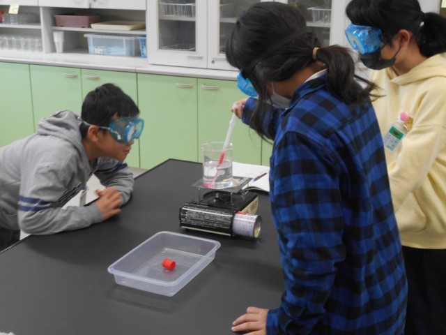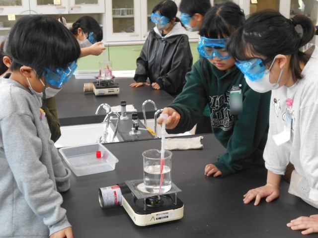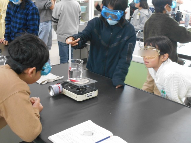 ものの温まり方の実験をしています。防護メガネをして、あたたまった水の流れを観察しています。