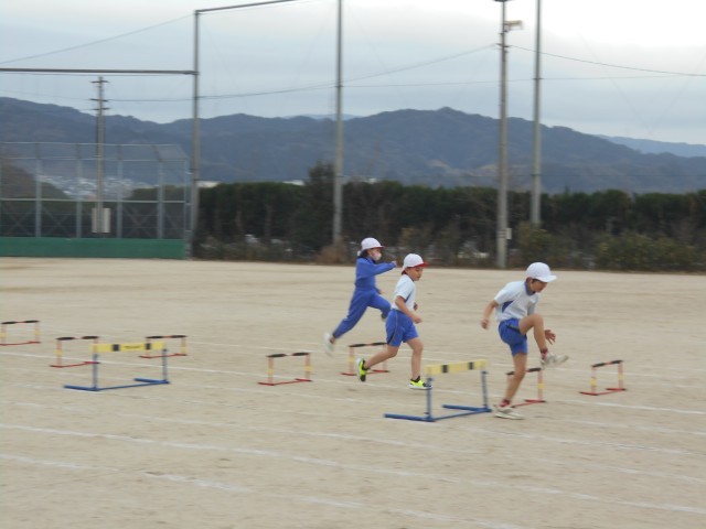 ハードルをリズムよく跳び、駆け抜けていました。寒い中、子どもたちは元気です。
