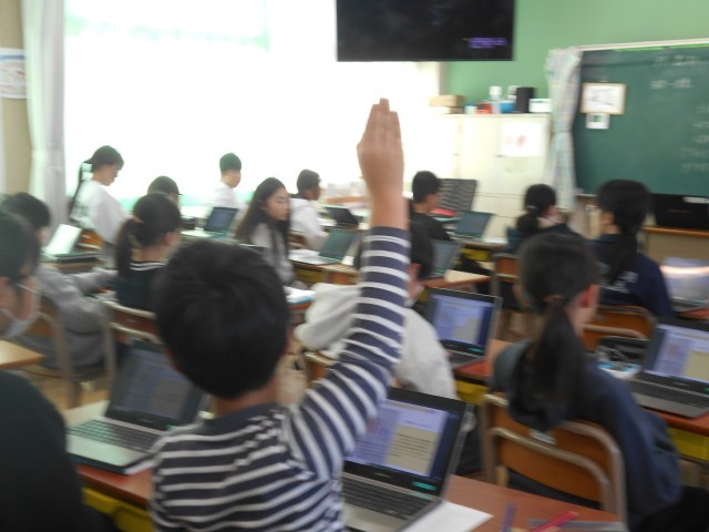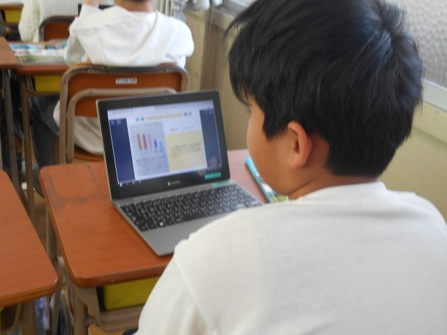 社会の調べ学習をして、分かったことを発表していました。タブレットの資料から読み解く力がついています。