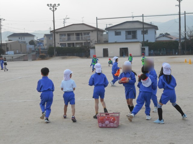 グループで協力して、ボールを向こう側に数多く運ぶゲームをしてました。しっかりと作戦をたてて走り抜けていました。