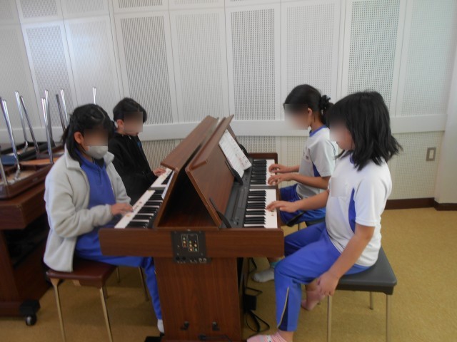 音楽室から素敵な合奏が聞こえてきました。先生のピアノに合わせて、リコーダーや、鍵盤ハーモニカ、木琴やオルガンを演奏し、すてきなハーモニーを奏でていました。