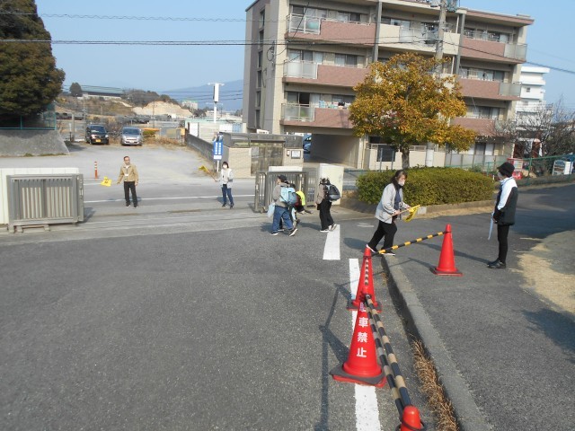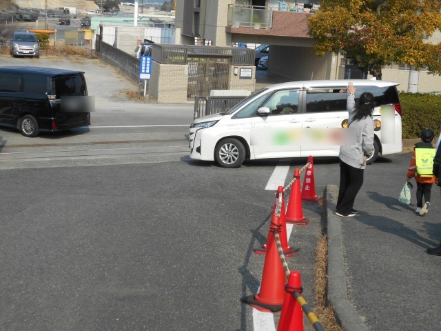 たくさんの放課後デイサービスの車や迎えの車が正門を出入りします。毎日、2~3名の職員が、横断旗をもって子どもたちの安全を守っています。