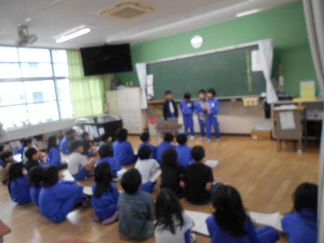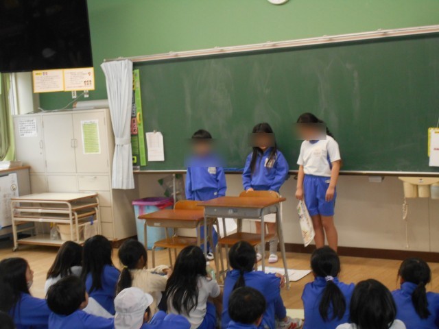 地域について調べたことを、明日の参観で発表するために、グループごとに練習をしていました。絵や写真などを使う工夫をしています。